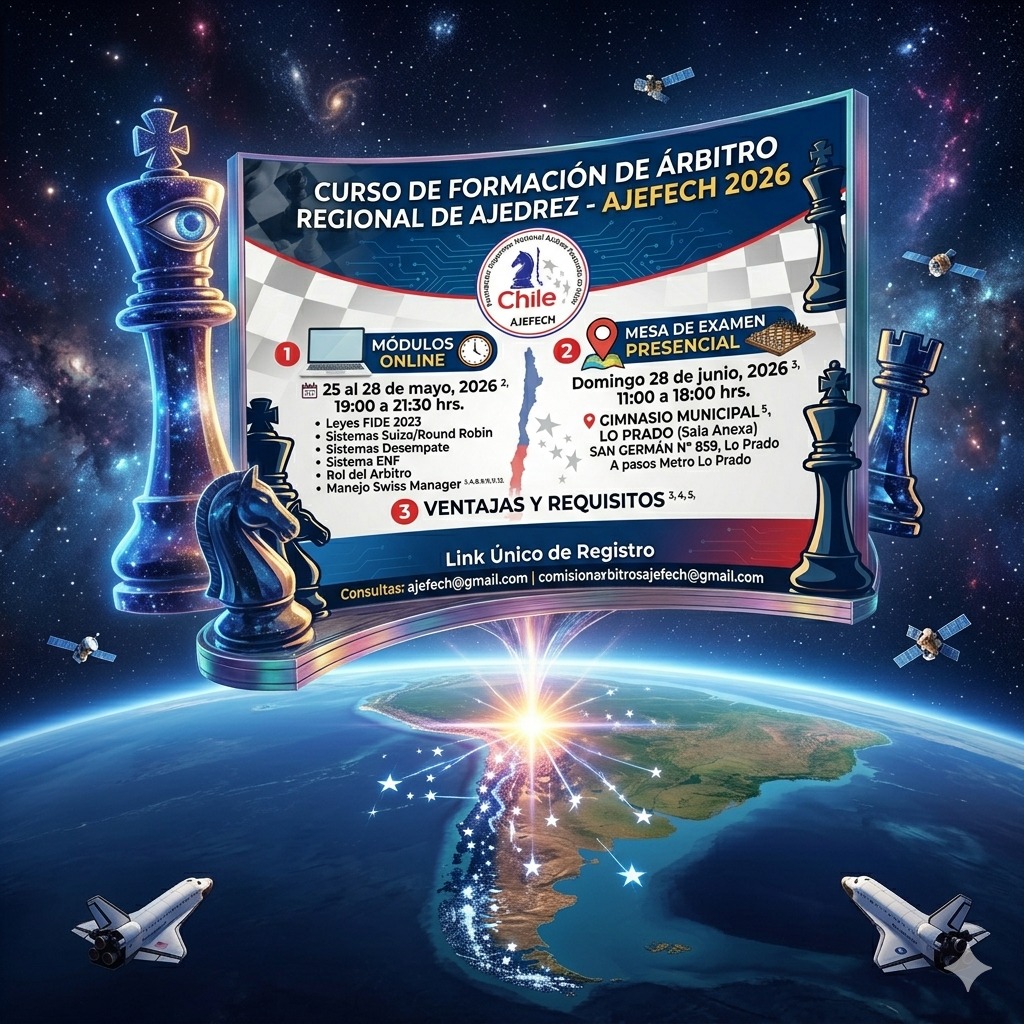La Federación de Ajedrez de Chile y la Comisión de Árbitros AJEFECH, anuncian la realización del Curso para formar Árbitro Regional de Ajedrez. Tendrá carácter online la exposición de los módulos y en forma presencial la Mesa de Examen, de acuerdo al siguiente cronograma: