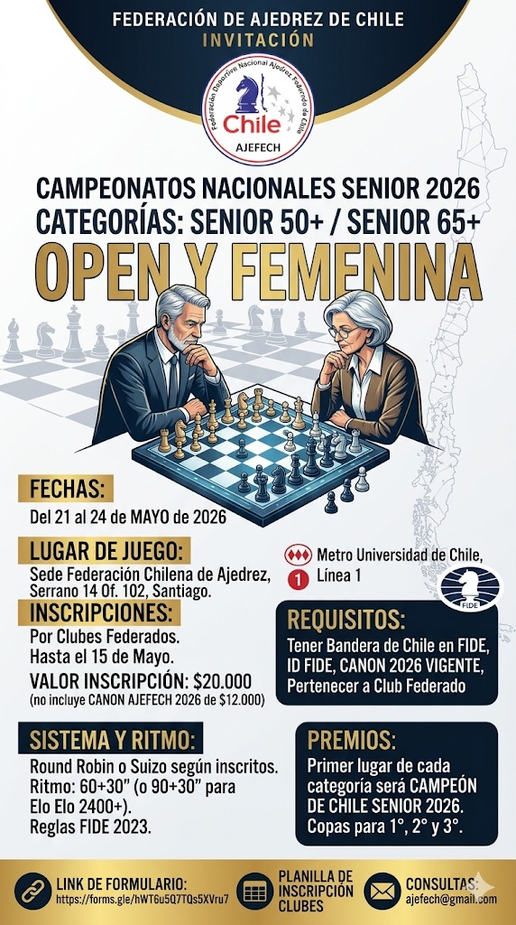 La Federación de Ajedrez de Chile tiene el agrado de invitar a todos los deportistas del país, que cuenten con bandera de Chile en la FIDE, a participar de los Campeonatos Nacionales Senior, Categorías 50 + y 65+, en Open y Femenina 2026, que se realizará en la ciudad de Santiago de Chile del 21 al 24 de mayo de 2026.