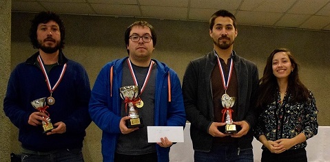 ![]() Premiación Torneo MI René Letelier: Nicolás Abarca (3er lugar) MI Pablo Salinas (Campeón), MI Pablo García (2do Lugar), Damaris Abarca (Presidenta AJEFECH) |