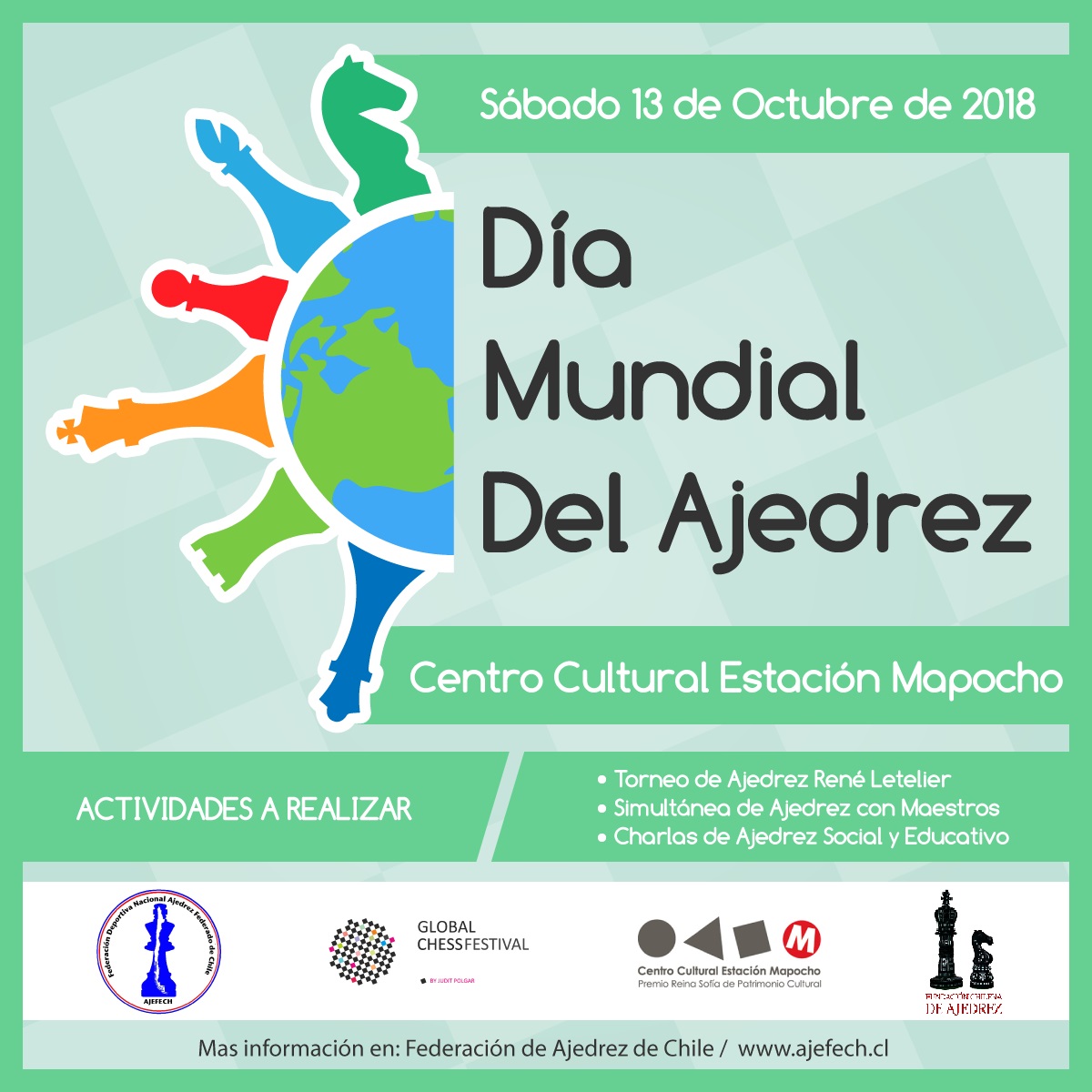 El pasado sábado 13 de octubre se realizó en dependencias del Centro Cultural Estación Mapocho de la ciudad de Santiago la celebración del Día Mundial del Ajedrez, evento que formó parte de las actividades del Global Chess Festival desarrollado por la Fundación Judit Polgar. La organización estuvo a cargo de la Federación de Ajedrez de Chile con apoyo de la Fundación Chilena de Ajedrez.