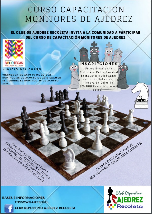 Con el propósito de perfeccionar las competencias de los Monitores de Ajedrez que se hayan certificado durante el año 2018 o anteriores, este sábado 28 de Noviembre a partir de las 09:00 horas se desarrollará una nueva versión del Seminario de Actualización para Monitores de Ajedrez el cuál permitirá a los participantes cumplir con las nuevas disposiciones del Plan Federado Docente AJEFECH.
