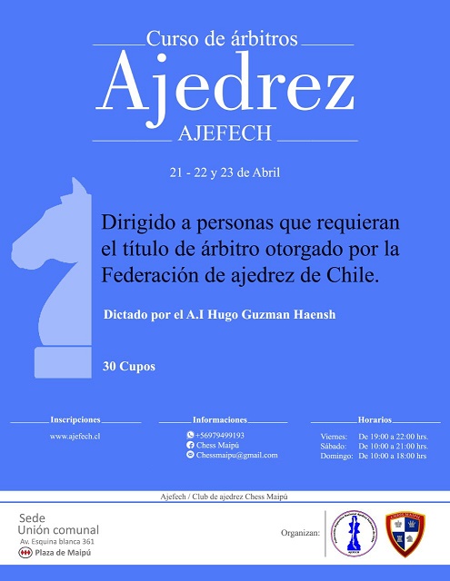 Entre el pasado 21 y 23 de Abril se realizó en la sede de la Unión Comunal de la I. Municipalidad de Maipú el primer curso para candidatos a Arbitros Nacionales y Regionales organizado por el Club de Ajedrez Chess Maipú. El curso contó con la participación de 23 personas, quienes estarán habilitados para realizar la mesa de exámen correspondiente el próximo 17 de Junio.