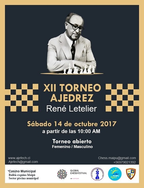 El próximo sábado 14 de Octubre en el Casino Municipal de la I. Municipalidad de Maipú (Calle Bailén esquina Maipú - sector piscina Municipal) se llevará a efecto la XII versión del Torneo en Memoria al primer Maestro Internacional de Ajedrez de Chile, don René Letelier Martner.