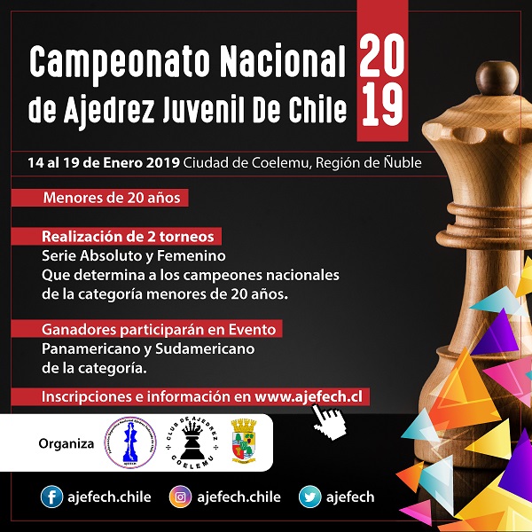 La Federación Deportiva Nacional Ajedrez Federado de Chile (AJEFECH) en conjunto con el Club de Ajedrez COELEMU y la Ilustre Municipalidad de Coelemu organizaron entre el pasado 14 y 19 de Enero la versión 2019 Absoluta y Femenina del Torneo Nacional de Ajedrez Juvenil de Chile (Menores de 20 años)