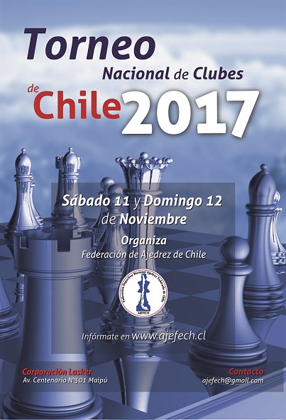 La Federación de Ajedrez de Chile organizó el pasado 11 y 12 de Noviembre la versión 2017 del tradicional Torneo Nacional de Clubes de Ajedrez de CHILE. El evento se llevó a efecto en la Sede de la Corporación de Ajedrez Lasker, ubicada en calle Centenario 310, Maipú realizándose conjuntamente en dicha ocasión la Asamblea General AJEFECH 2017 el día sábado 11 de Noviembre a las 20:00 hrs. El evento tuvo un récord de participación de 22 instituciones, provenientes desde Antofagasta hasta Chiloé, las cuales disputaron el título de Campeón Nacional de Clubes AJEFECH 2017. Campeón del evento resultó el CLUB DE AJEDREZ CHILE, quien obtuvo un total de 12 puntos en virtud de 6 matchs ganados y sólo una derrota. El segundo lugar correspondió al equipo del CLUB DE AJEDREZ BOBBY FISCHER DE TALCA, con igual cantidad de unidades pero menos puntos individuales. El tercer lugar en tanto fue obtenido por el CIRCULO DE AJEDRECISTAS DE LOS ÁNGELES con un total de 11 puntos.