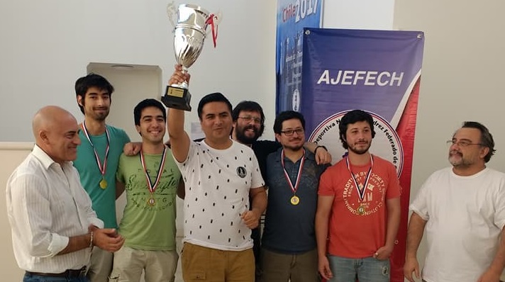 Club Ajedrez Chile campeón de Clubes 2017. En la imagen: GM Iván Morovic (entregando la copa), Claudio Olivares, Gonzalo Sánchez, Leonardo Rojas, Diego Muñoz (Presidente Club Chile), Diego Romero, Nicolás Abarca y Juan Carlos Mundaca (Presidente AJEFECH)