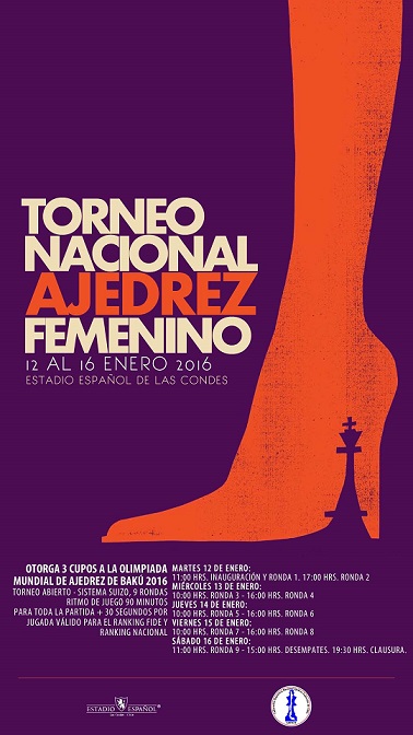 La Federación de Ajedrez de Chile en conjunto con el Estadio Español de Las Condes organizaron entre el pasado 12 y 16 de Enero la versión año 2016 del Campeonato Femenino de Chile. El torneo se realizó en el Salon de la Juventud del Estadio Español de las Condes siendo abierto para todas las damas de nacionalidad Chilena o bien con residencia en Chile. El formato del torneo fue de 9 rondas a un ritmo de juego de 90 minutos para toda la partida + 30 segundos por jugada, siendo válido para el Elo Nacional y el Elo FIDE. Desempates : Resultados entre empatados, Progresivo, Rating Performance. De acuerdo a lo establecido en el Reglamento Olimpico 2016, el torneo otorgó 3 plazas para el equipo olimpico Femenino que representará a Chile en Las Olimpiadas Mundiales de Ajedrez que se realizarán en Baku en Septiembre del 2016. Campeona del Evento se coronó la WIM Valentina JORQUERA CABELLO (Rancagua), quien totalizó 7 puntos siendo seguida por la jugadora de Concepción Lesly FUENTES INSULZA con 6,5 unidades. Ambas lograron su cupo para las Olimpiadas Mundiales de Ajedrez de Manera Directa (Por confirmar según reglamento de partidas FIDE) . El tercer lugar del torneo fue compartido en tre las jugadoras Javiera GOMEZ BARRERA (Valdivia) y Mackarena GONZALEZ DELGADILLO (Quillota) quienes debieron recurrir a un match de desempate que se inclinó a favor de la Jugadora de Valdivia luego de 2 partidas a ritmo de 25 minutos y 2 partidas a ritmo de 10 minutos.