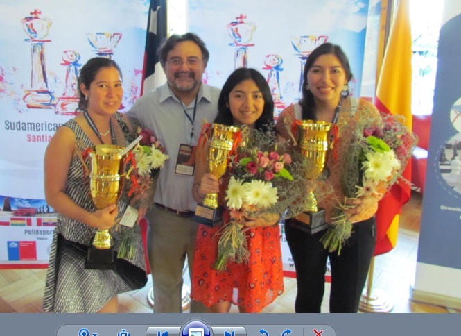 El presidente de AJEFECH Juan Carlos Mundaca junto a las 3 primeras ubicaciones del Torneo, Valentina Jorquera (Campeona), Javiera Gómez (Tercer Lugar) y Lesly Fuentes (Vicecampeona) |