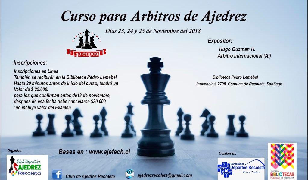 Entre el próximo 20 y 22 de Mayo La Federación de Ajedrez de Chile organizará un curso de Capacitación para aspirantes a Árbitros Nacionales y Regionales de Ajedrez.