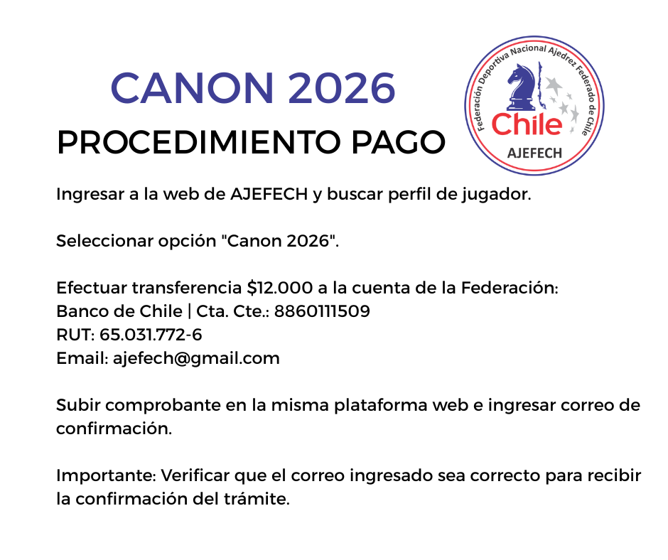 En cumplimiento con lo acordado en la Segunda Asamblea General Ordinaria 2025 de la Federación Chilena de Ajedrez, llevada a cabo en Santiago el 22 de noviembre de 2025, se publican los aranceles oficiales que entrarán en vigencia para el año 2026.