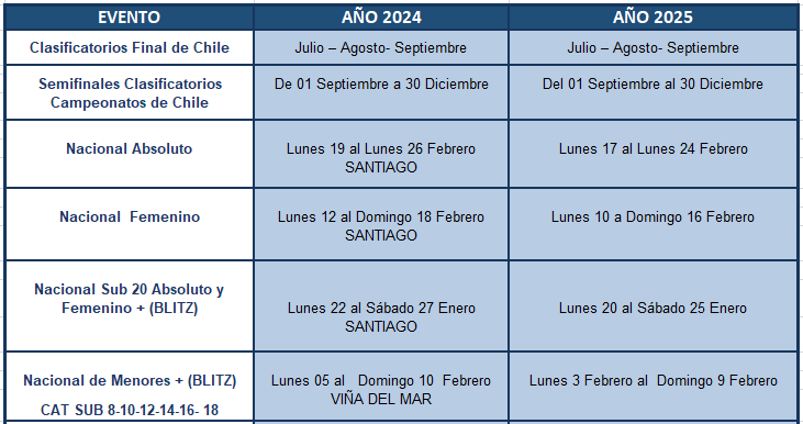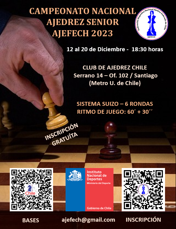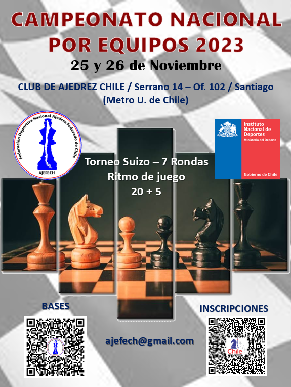 La Federación Deportiva Nacional Ajedrez Federado de Chile (AJEFECH) en conjunto con el CLUB DEPORTIVO CHESS VIÑA DEL MAR, con el apoyo de la Municipalidad de Viña del Mar comunica a todos los ajedrecistas de Chile que se encuentran abiertas las inscripciones para participar de los Campeonatos Chilenos de Ajedrez 2024 para las categorías Sub 08 hasta Sub 18 que se realizarán entre el 5 de y 10 de Febrero de 2024 en el GIMNASIO POLIDEPORTIVO de VIÑA DEL MAR, ubicado en avenida Padre Hurtado Nº 300. VIÑA DEL MAR.