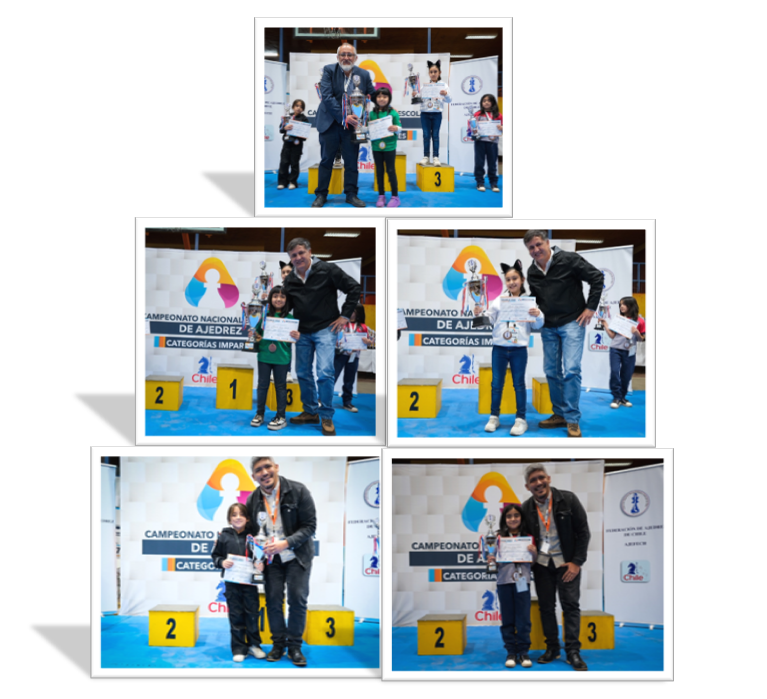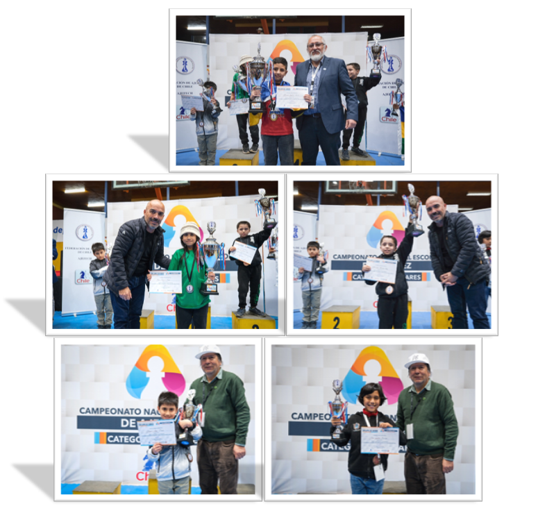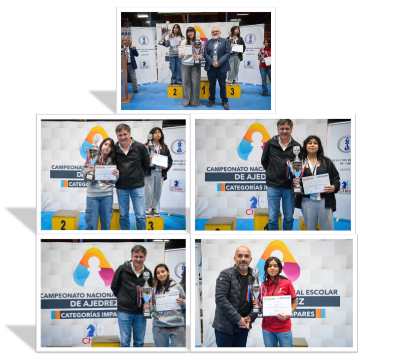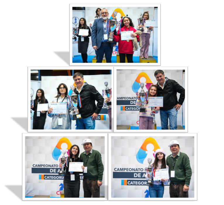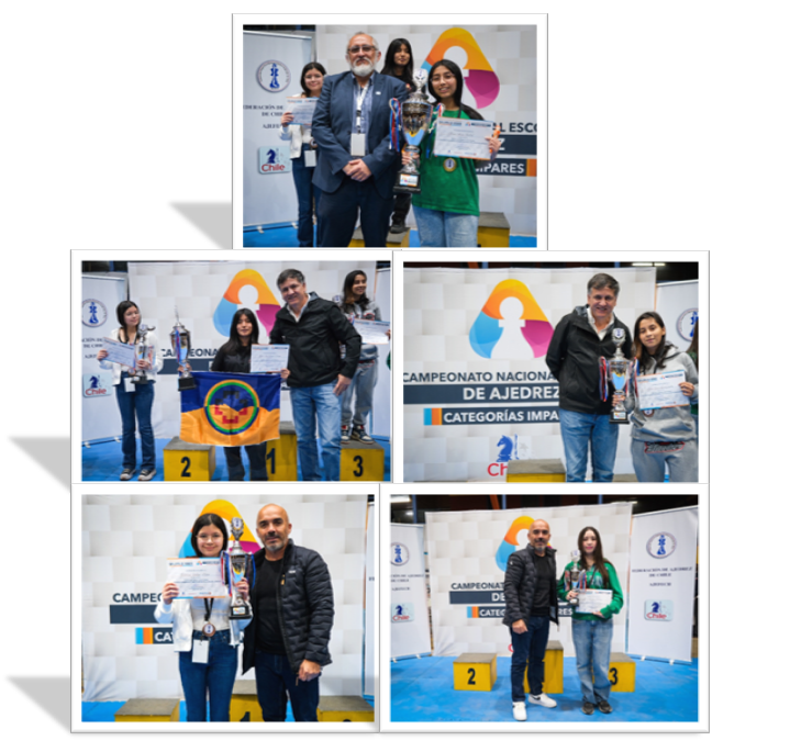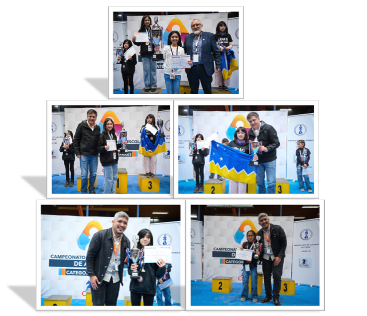 1er lugar: Sofía Alejandra Aguayo Carreño (Club de Ajedrez Recoleta) 2do lugar: Valentina Segovia Ganzur (Club de Ajedrez Jugadas Estratégicas) 3er lugar: María Ignacia Guerra Mansilla (Club de la Universidad de Magallanes) 4to lugar: Camila Helena Silva Carrasco (Club de Ajedrez The Last King) 5to lugar: Sofía Anahí Quezada Quijada (Club Ajedrez Cordillera) |