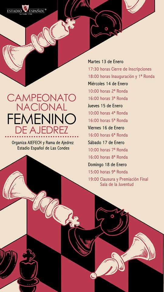 La Federación Deportiva Nacional de Ajedrez Federado de Chile (AJEFECH) en conjunto con la Rama de Ajedrez del Estadio Español de Las Condes y con la colaboración de la Fundación Chilena de Ajedrez organizaron entre el pasado 13 y 18 de Enero de 2015 el Campeonato Nacional Femenino de Ajedrez 2015. El evento se llevó a cabo en dependencias del Estadio Español de Las Condes siendo de caracter abierto para toda jugadora Chilena. Campeona del Torneo con un impresionante puntaje de 7,5 puntos en 9 partidas resultó la joven representante de la Universidad Andrés Bello sede Viña del Mar CONSTANZA BERNAL HURTADO. En segundo lugar remató la jugadora GIANELLA LUNA BENALCAZAR en empate con VALENTINA JORQUERA CABELLO y MONSERRAT MORALES FLORES todas con 6,5 puntos. Con este resultado Constanza Bernal clasifica directamente a las Olimpiadas Mundiales de Ajedrez que se realizarán en Bakú el año 2016. Información CHESS-RESULTS - PARTIDAS EN PGN - BASES GENERALES Galeria de Imagenes FACEBOOK |