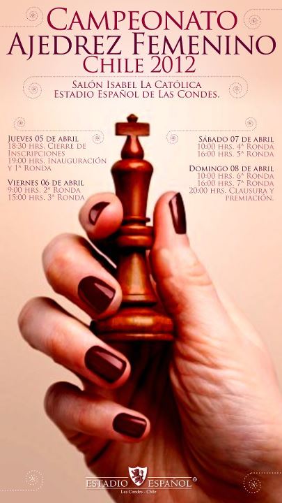 La Federación de Ajedrez de Chile en conjunto con el Estadio Español de Las Condes organizaron la versión año 2012 del Campeonato Chileno de Ajedrez Femenino. Este evento se realizó entre el pasado 5 y 8 de Abril, en las dependencias del Estadio Español de Las Condes - Salón Reina Isabel la Católica. Participaron un total de 40 jugadoras provenientes de todo el país, quienes disputaron los dos cupos para las Olimpiadas Mundiales de Ajedrez que entregaba el torneo a las dos primeras posiciones. Campeona del torneo resultó ser la jugadora Damaris Abarca González, estudiante de derecho de la Universidad de Chile, quien campeonó en solitario al obtener un total de 6 puntos en 7 partidas, merced a cinco victorias y dos empates. El segundo lugar lo obtuvo la señorita María José Toro Pradenas, campeona de la edición pasada del torneo y ya clasificada al equipo olímpico, quien completó 5,5 unidades, igual cantidad de puntos que Mariela Cortés Arias (Antofagasta) y Renate Steffen (Osorno). Se hace mención que de acuerdo al Reglamento Clasificatorio publicado el pasado mes de Enero, el torneo entregaba cupos a la Olimpiada de Estambul al primer y segundo lugar del torneo. El torneo se realizó a un total de 7 rondas ritmo de juego de 90 minutos para toda la partida + 30 segundos de incremento por jugada.
