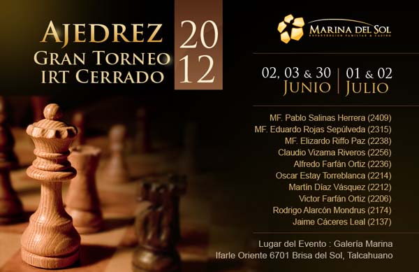 Durante las fechas del 2,3, 30 de Junio y 1 y 2 de Julio se desarrollará en las dependencias del Casino Marina El Sol de Talcahuano un atractivo torneo Cerrado de Ajedrez el cual congregará a los mejores representantes de la Zona en un evento de gran atractivo e interés para todo el país.