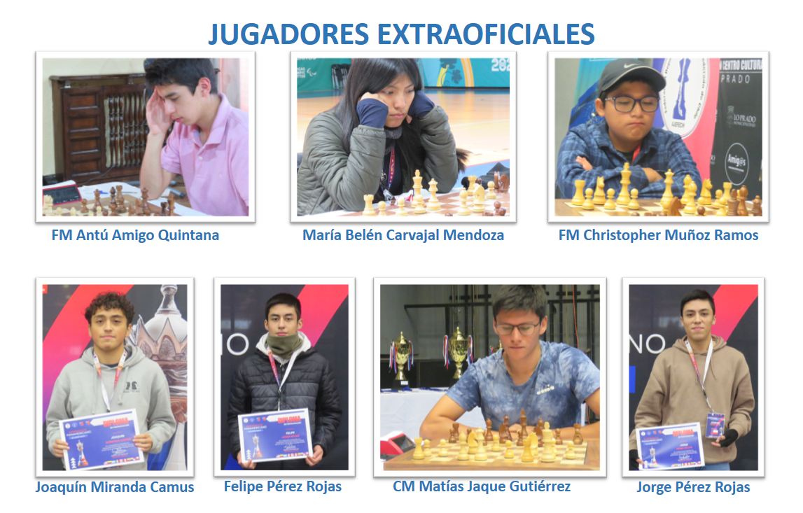 1er lugar: Tobías Passmore Bowman (Club de Ajedrez Cordillera) 2do lugar: Stjepan Antonio Vrsalovic Acuña (Instituto Level Up) 3er lugar: Priyank Ganguly Ganguly (Club de Ajedrez Ñuñoa) 4to lugar: Oscar Santiago Gacitúa Espinoza (Area V) 5to lugar: Aaron Pizarro Rozas (Club Academia de Ajedrez Siete Hojas) |