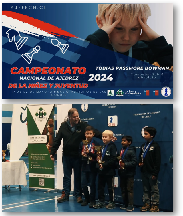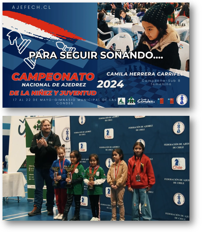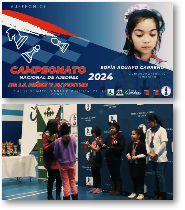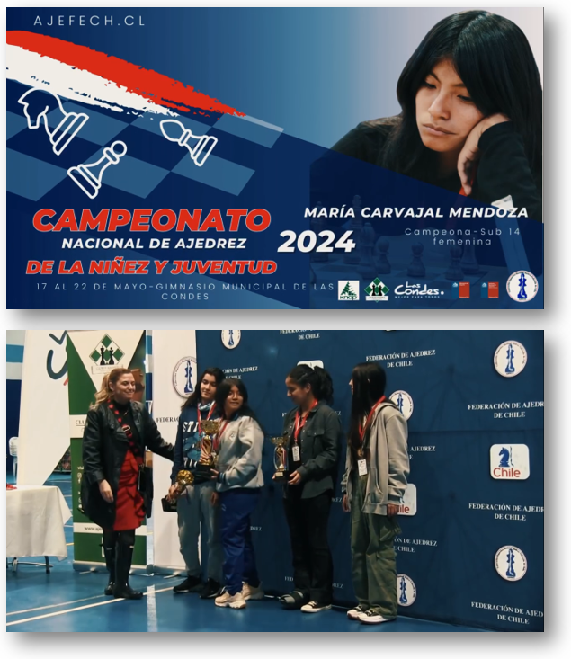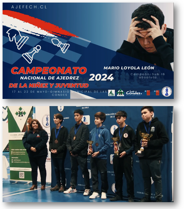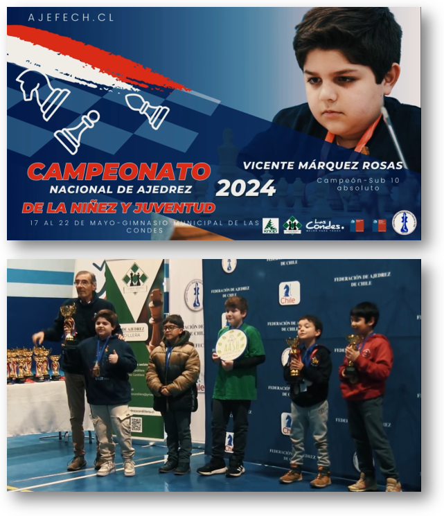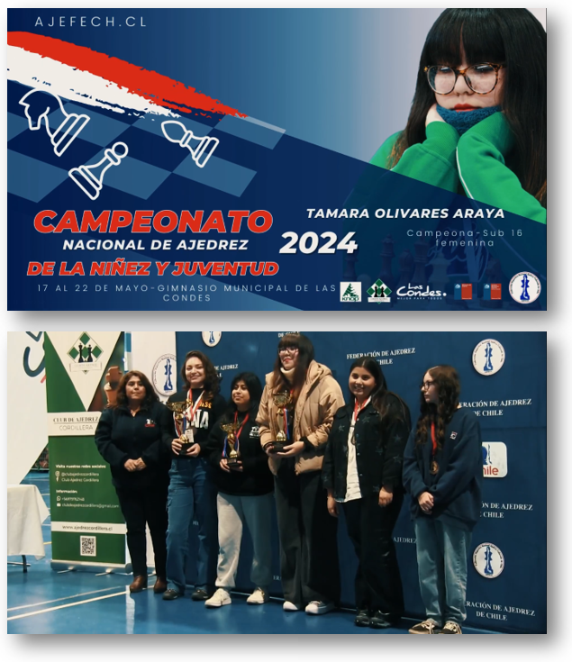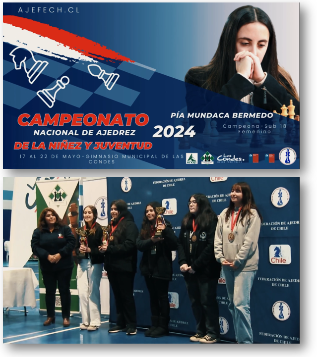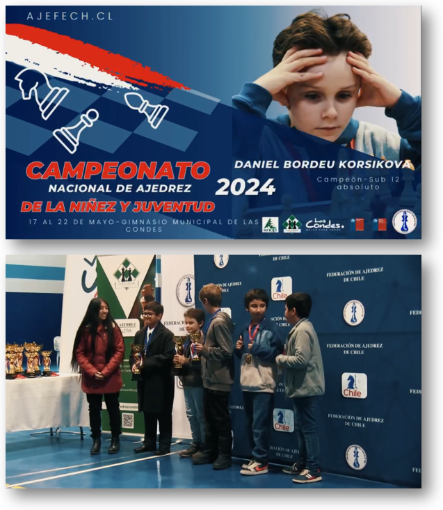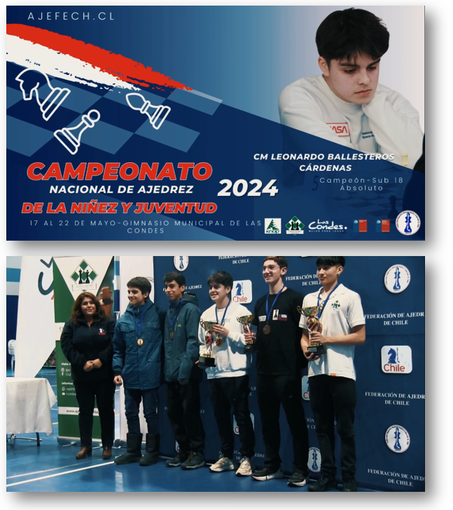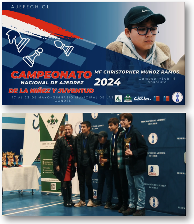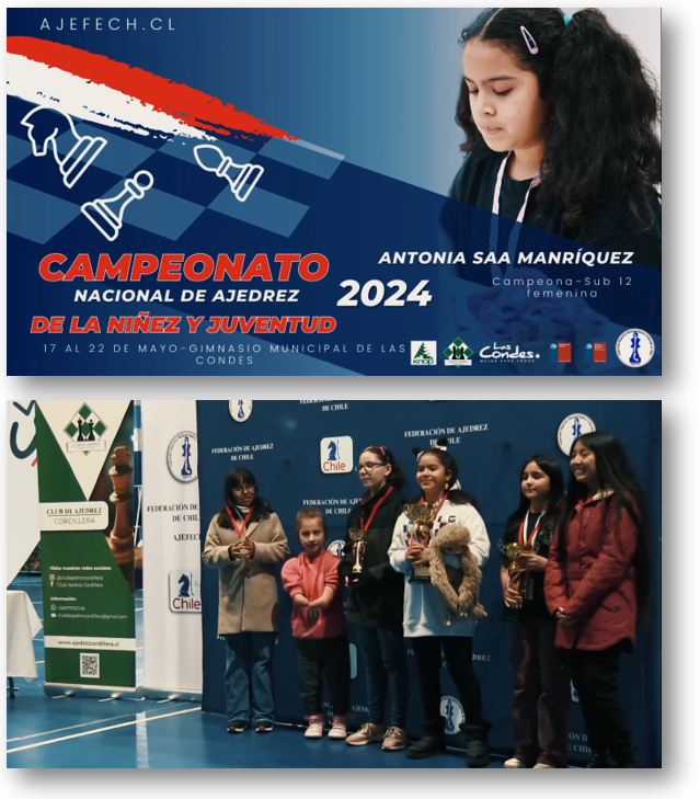 Compartimos con toda la comunidad ajedrecística la galería de imágenes con los cuadros de honor del CAMPEONATO NACIONAL DE AJEDREZ DE LA NIÑEZ Y JUVENTUD 2024, realizado del 17 al 22 de Mayo en el Gimnasio Municipal de Las Condes, con el apoyo del Instituto Nacional del Deporte, la Municipalidad de Las Condes y el Club de Ajedrez Cordillera, con la participación de 528 deportistas de categorías sub08, sub10, sub12, sub14, sub16 y sub18, tanto femeninas como absolutas.