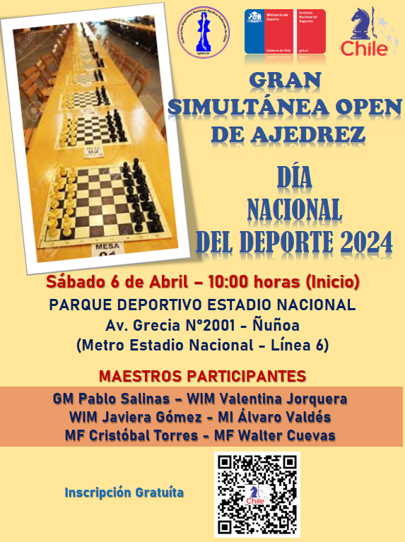 Por primera vez el Ajedrez está considerado a estar presente en esta importante conmemoración, por lo mismo, la Federación de Ajedrez de Chile ha organizado una GRAN SIMULTÁNEA OPEN dirigida a todos quienes deseen participar representando a sus clubes, colegios, academias, universidades, para hacerse presente llevando sus respectivas poleras institucionales.